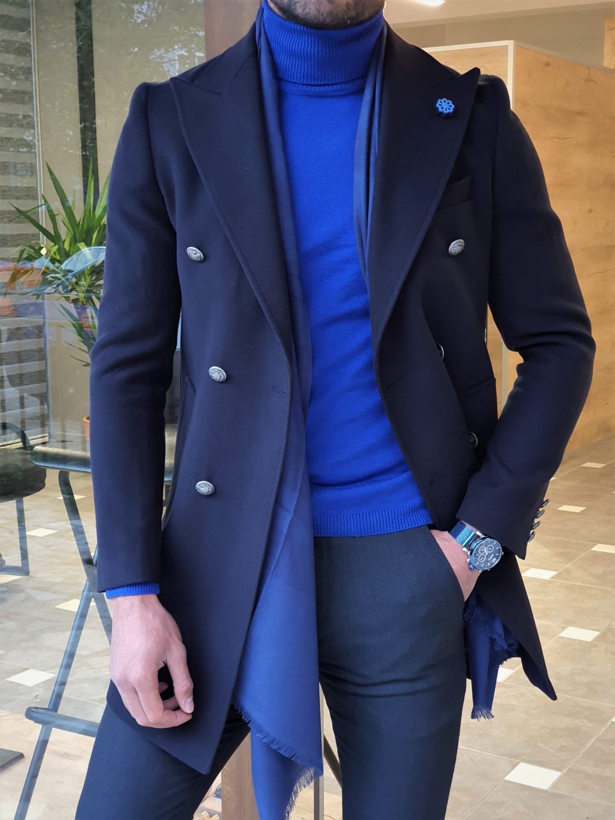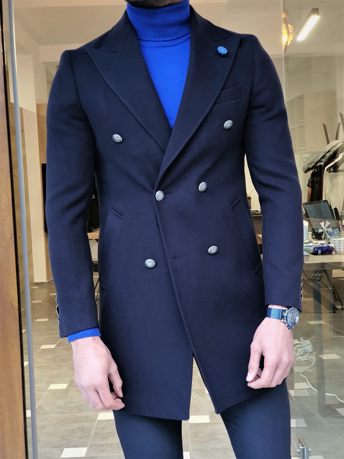 Your package will include the sophisticated navy blue wool coat, perfect for the season.