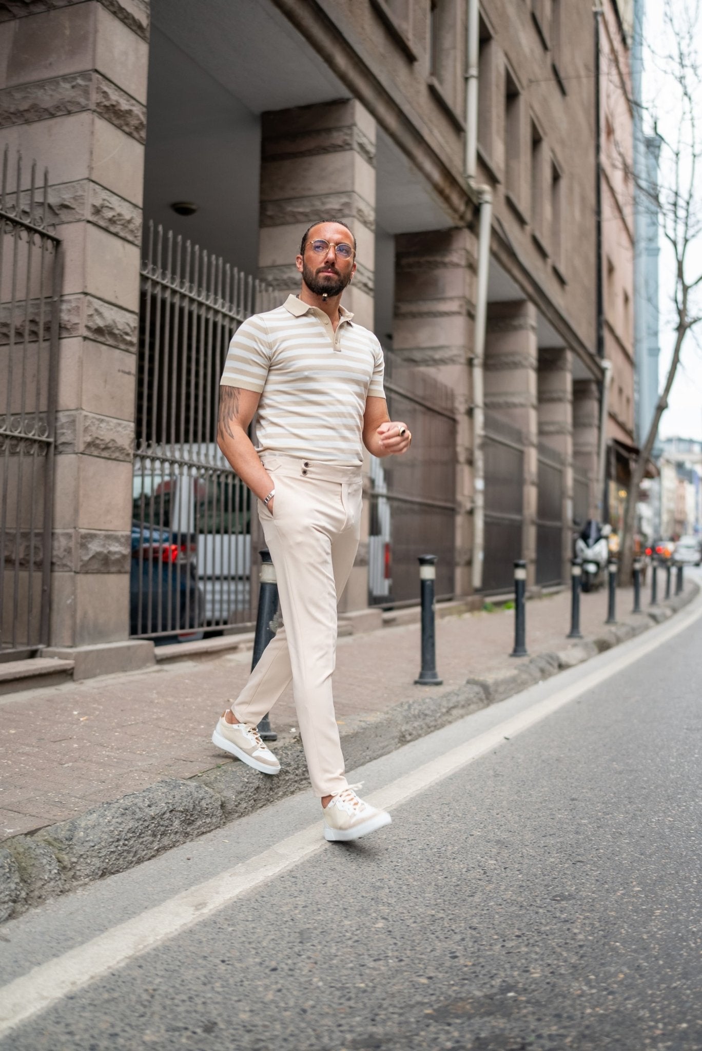 We're Featuring Special Design Slim Fit Beige Stripped Patterned Polo Neck Knitwear